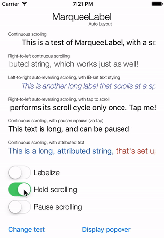 MarqueeLabel - A drop-in replacement for UILabel, which automatically adds a scrolling marquee effect when the label's text does not fit inside the specified frame. •